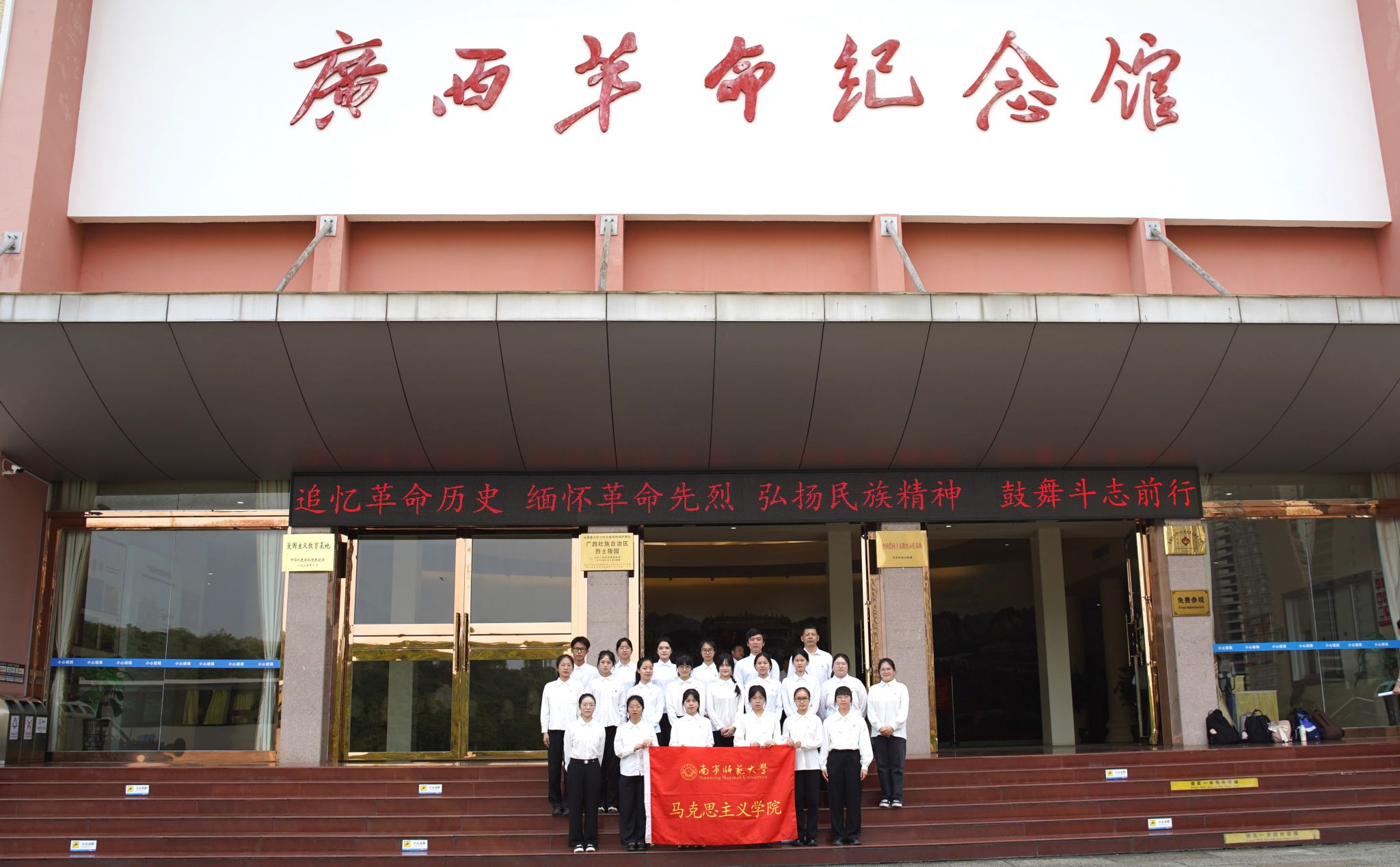 活动伊始,在庄严的国歌声中,全体人员肃立,向烈士纪念碑敬献鲜花,以表达对烈士们的崇高敬意和深切缅怀之情。随后,在讲解员的细致引导下,同学们逐一参观了新民主主义革命、土地革命、抗日战争、解放战争四个时期的广西革命史展厅。在讲解员生动的解说下,同学们仿佛穿越历史长河,亲身感受了广西军民在中国共产党的领导下,英勇奋战、不畏牺牲的壮丽历史画卷。