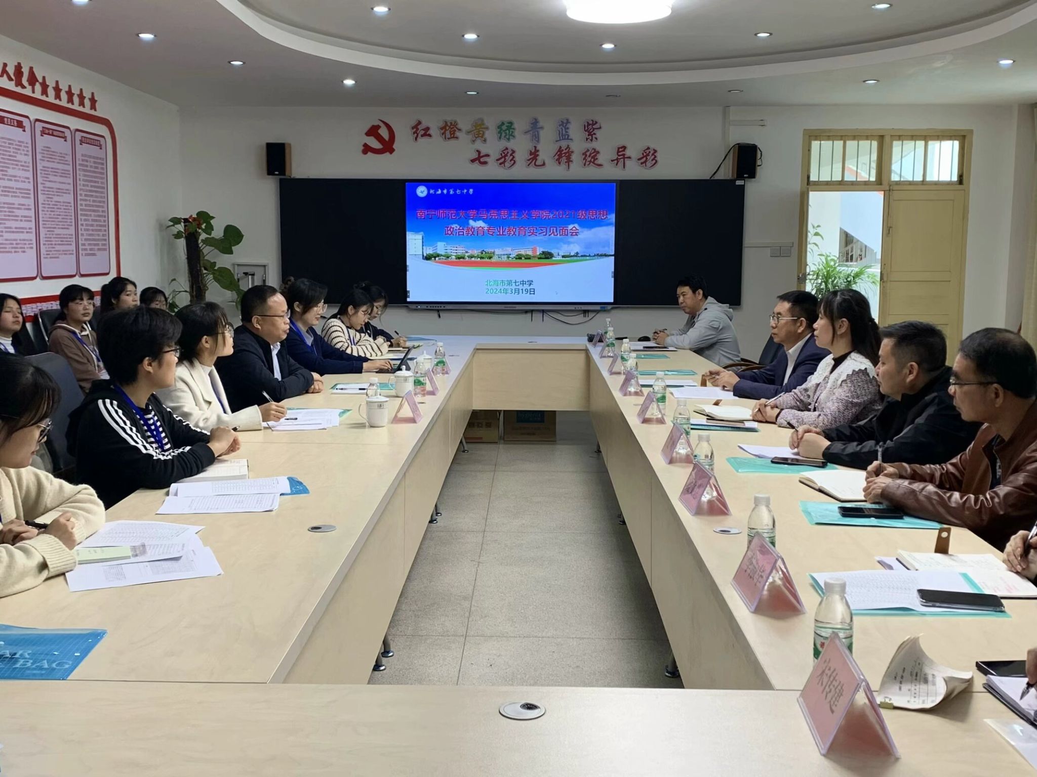 上午十一点,双方在北海市第七中学思行楼三楼会议室召开了见面会。北海七中郭军校长、许鑫滢副校长、文峰副校长、课程发展中心凌文总主任、教师发展中心李淑华主任、学生发展中心宋传建主任出席会议,会议由课程发展中心庞艺副主任主持。庞艺副主任先简单介绍了此次实习安排的指导老师都是骨干教师组成的队伍,校方也已制定了教学计划和活动,希望同学们在实习期间能够切身体会“无梦想不北七,无奋斗不北七,无激情不北七,无成绩不北七,无幸福不北七”。随后郭军校长以《筑梦不负韶华,相遇共促成长》进行了发言,围绕办学条件、师资队伍、发展远景、办学理念、工作思路等方面介绍了学校的基本情况,对实习生的到来表示热烈的欢迎并希望同学们珍惜机会,尽快转变角色,适应、了解、体验高中教育教学管理全过程。
