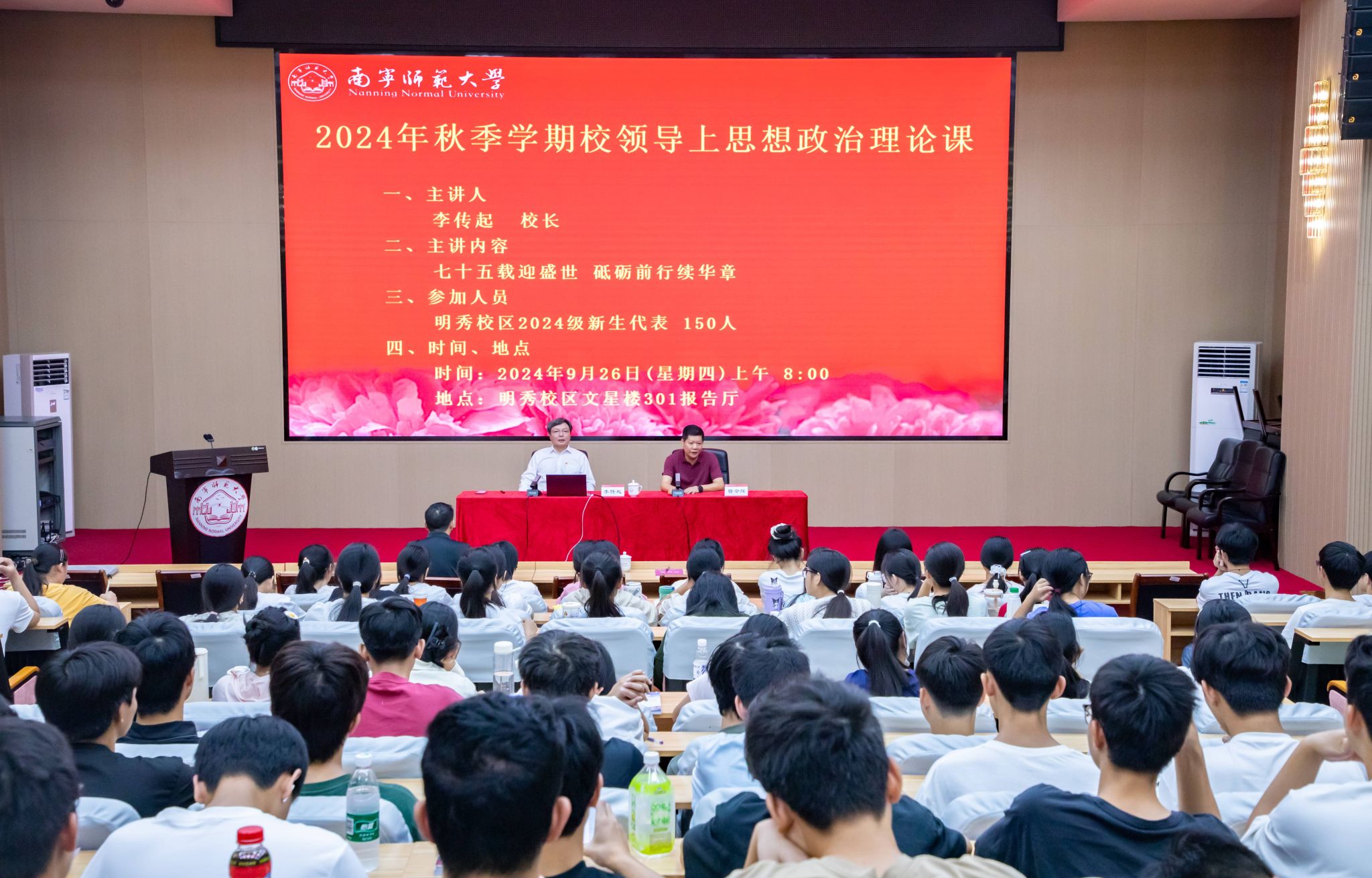 为深入推进“大思政课”建设,落实立德树人根本任务,把思想政治教育贯穿人才培养全过程。9月26日上午,李传起校长以“七十五载迎盛世砥砺前行续华章”为题,讲授2024年秋季学期“大思政课”。明秀校区各学院新生代表在文星楼301报告厅听课。本次“大思政课”由betway必威西汉姆联院长曾令辉教授主持。