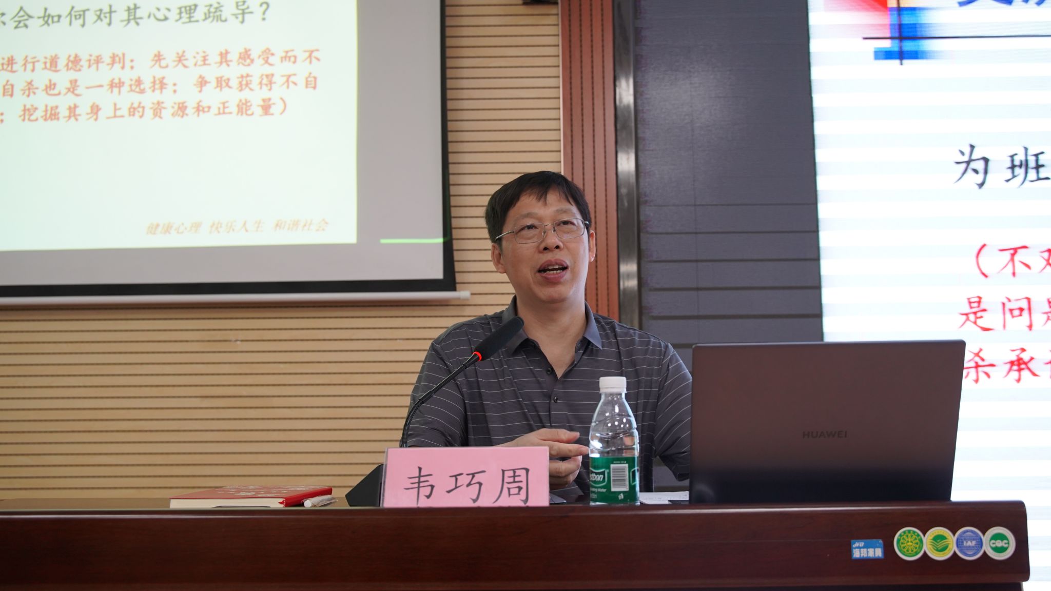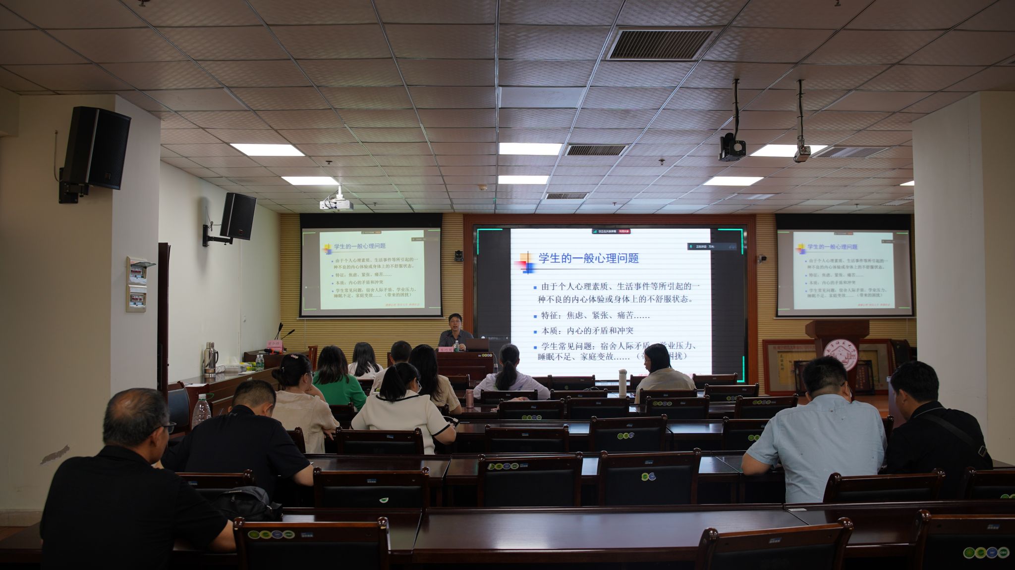 本次专题培训采取“线上”+“线下”同步的方式进行。韦巧周老师结合理论研究和临床实践,从判定不同的心理状态切入主题,从“学生的一般心理问题、解决学生心理问题的基本模式、与学生交流沟通的基本原则、心理异常的识别、导致校园心理危机的常见因素以及常见的心理疾病”等六个方面展开。