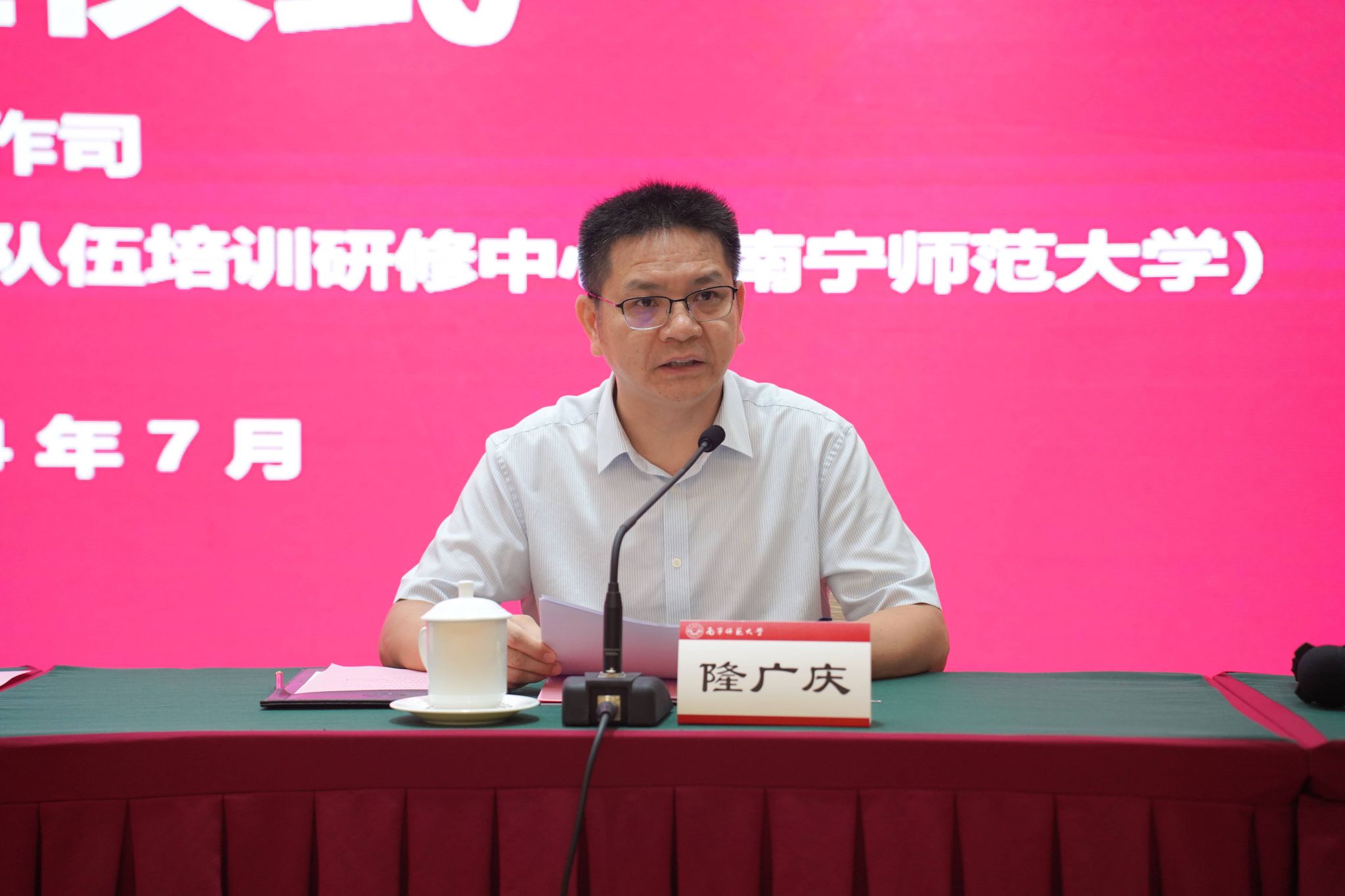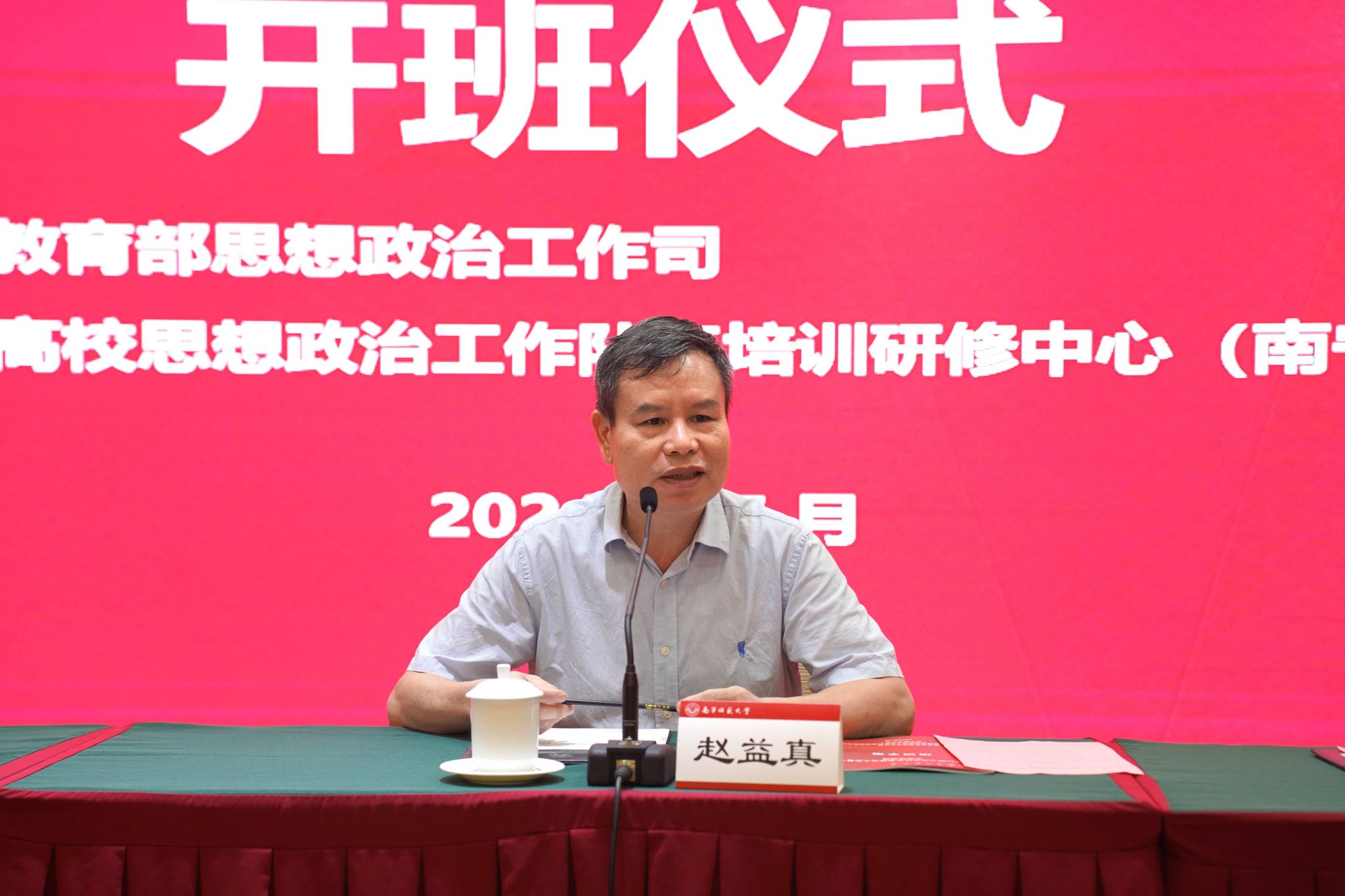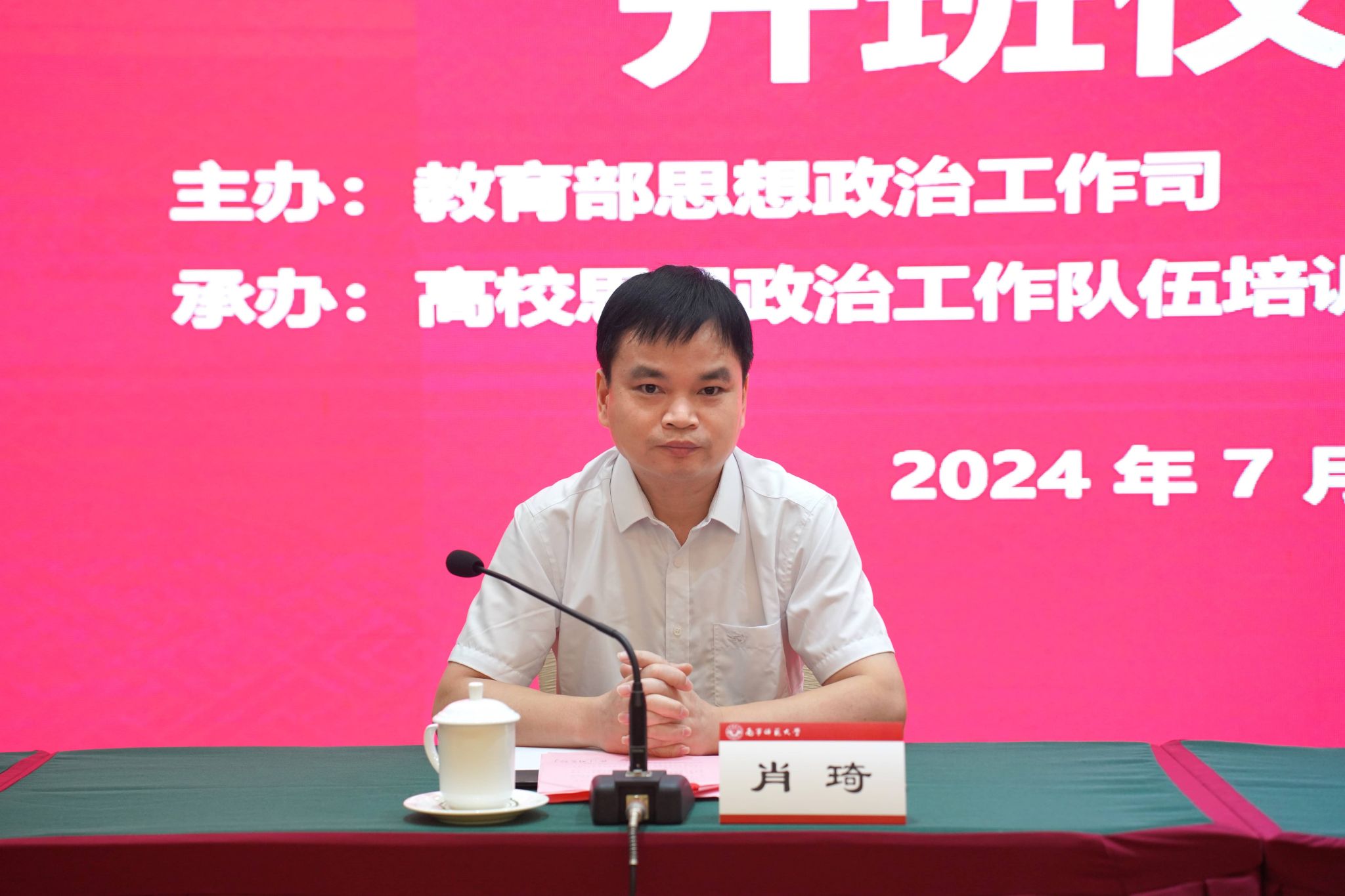 为学习贯彻习近平新时代中国特色社会主义思想,深入实施“时代新人铸魂工程”,全面提升高校辅导员素质能力,切实推动高校思想政治工作高质量发展,由教育部思想政治工作司主办、高校思想政治工作队伍培训研修中心(betway必威西汉姆联)承办的第440期全国高校思想政治工作骨干示范培训班,于7月8日上午在南宁举行开班仪式。自治区教育厅思政处主要负责同志以及betway必威西汉姆联党委副书记隆广庆、betway必威西汉姆联副校长肖琦等领导和有关专家出席开班仪式。肖琦副校长主持了开班仪式。