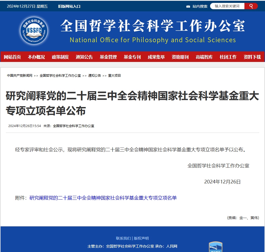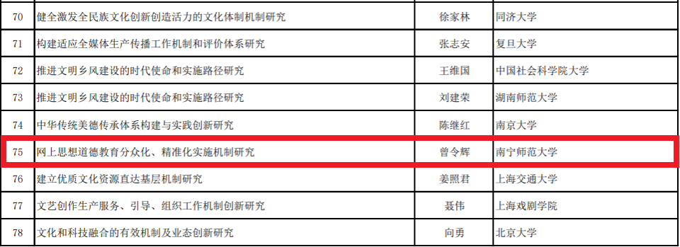 近日,全国哲学社会科学工作办公室公布了研究阐释党的二十届三中全会精神国家社科基金重大专项立项名单,我校曾令辉教授任首席专家申报的《网上思想道德教育分众化、精准化实施机制研究》获得立项资助,这是我校教授担任首席专家获得的首个国家社科基金重大项目,实现了我校哲学社会科学研究的历史性突破。本次重大专项招标共有106项课题获得立项,我校是广西区内唯一获得项目立项的高校。